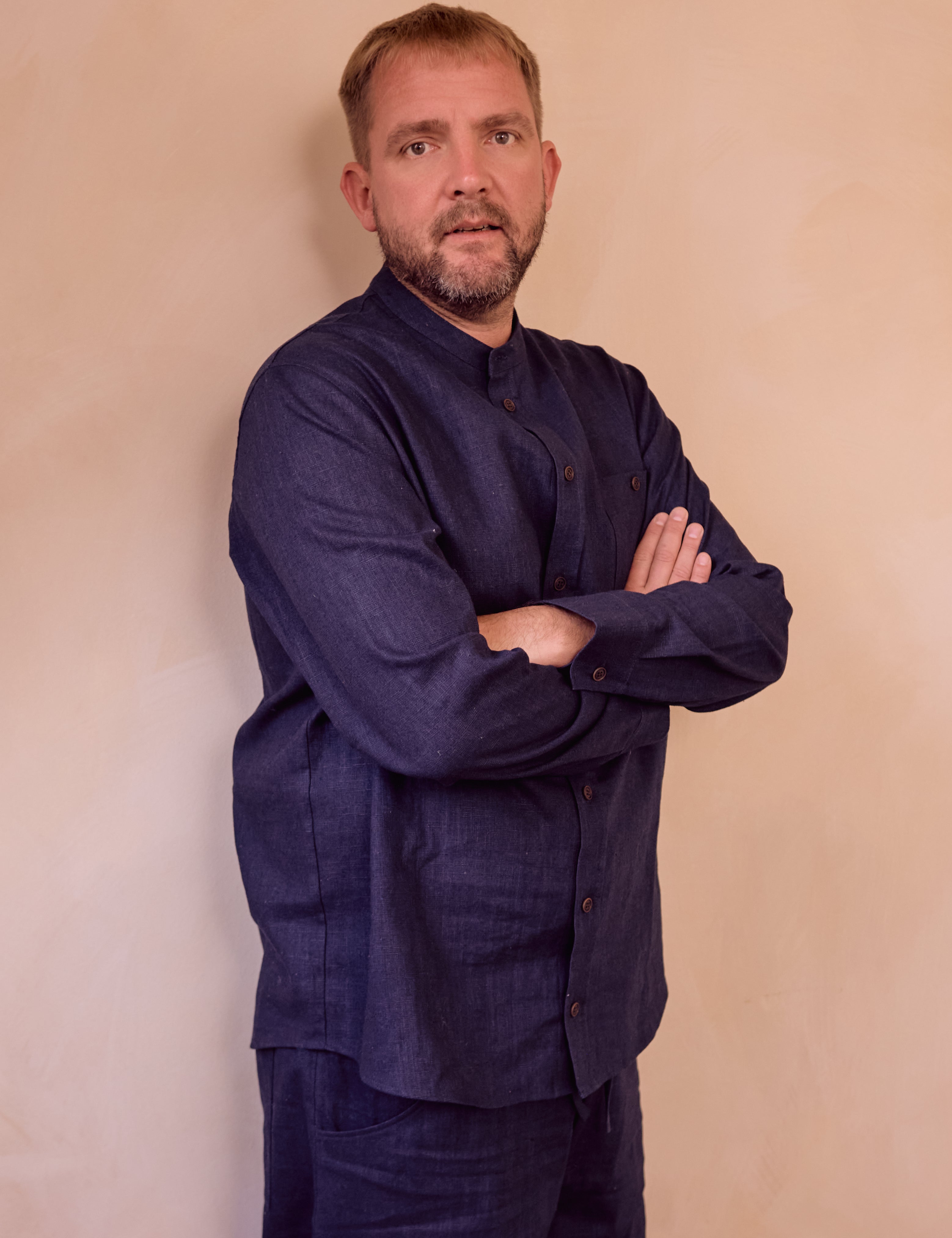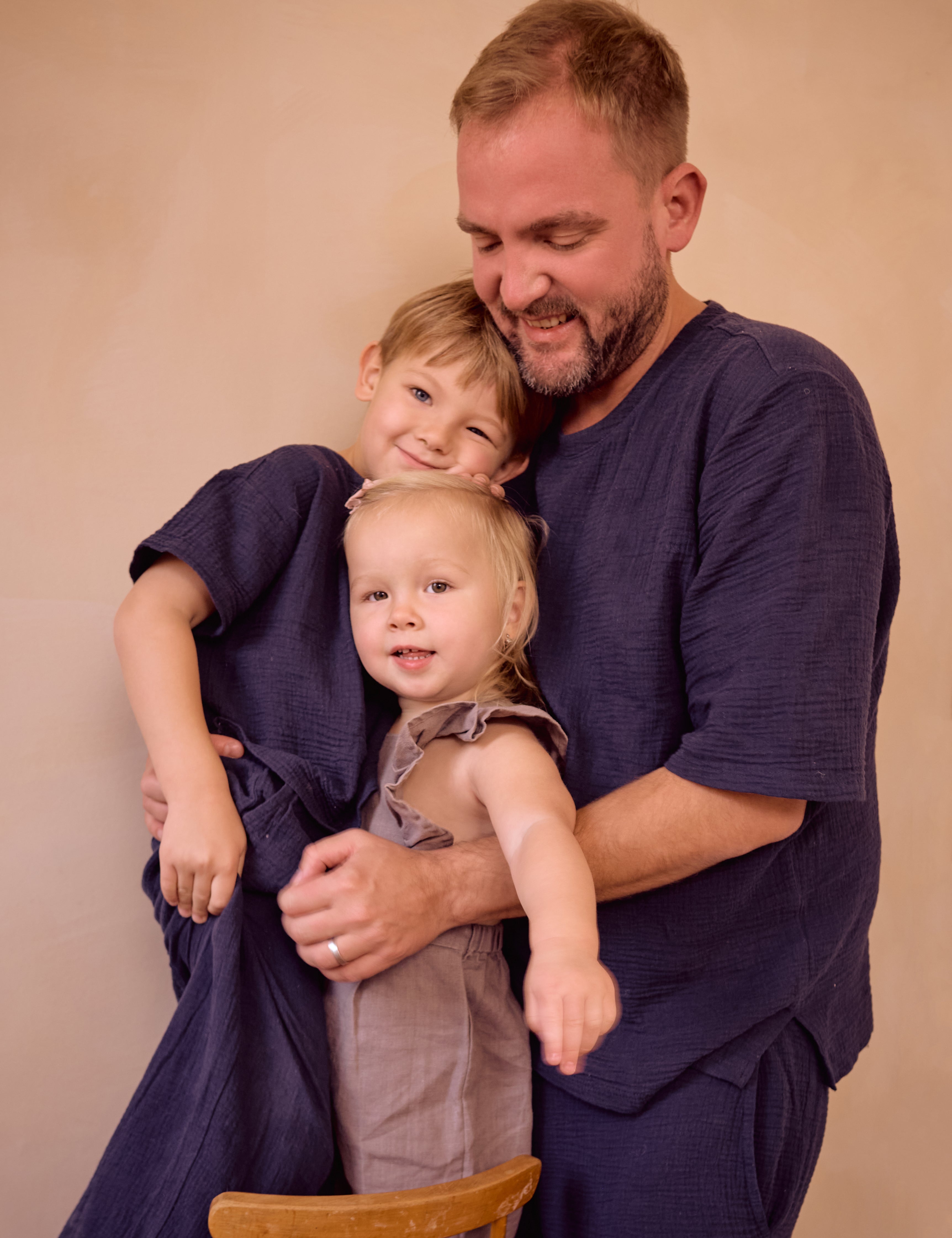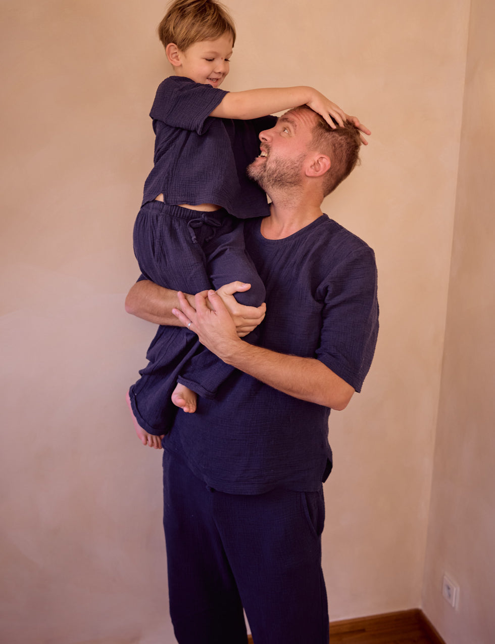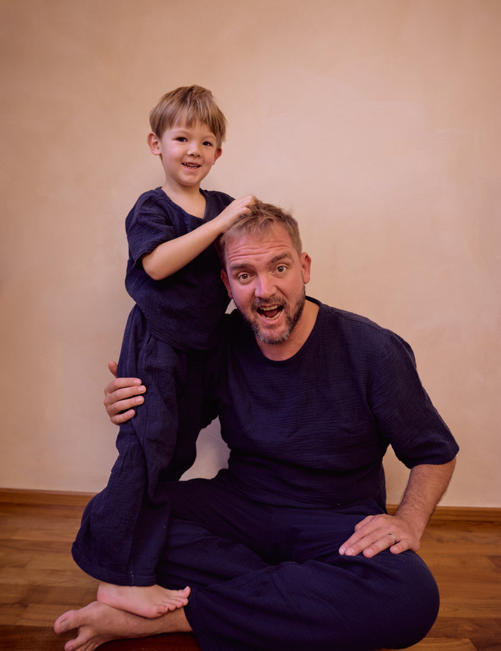 Společné kousky pro táty a jejich syny, vyrobené z pečlivě vybraných přírodních materiálů – bavlněného mušelínu a lnu. Pánské oblečení je nyní v předprodeji s dodáním přibližně do tří týdnů od objednání.