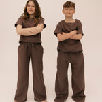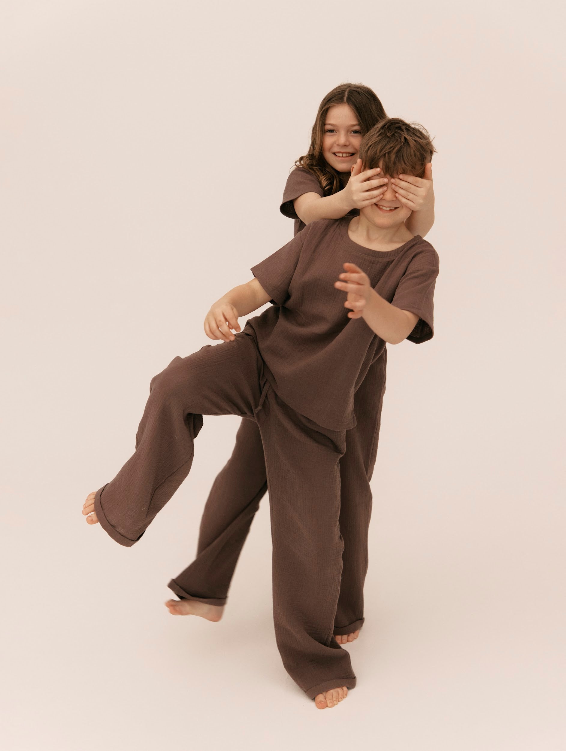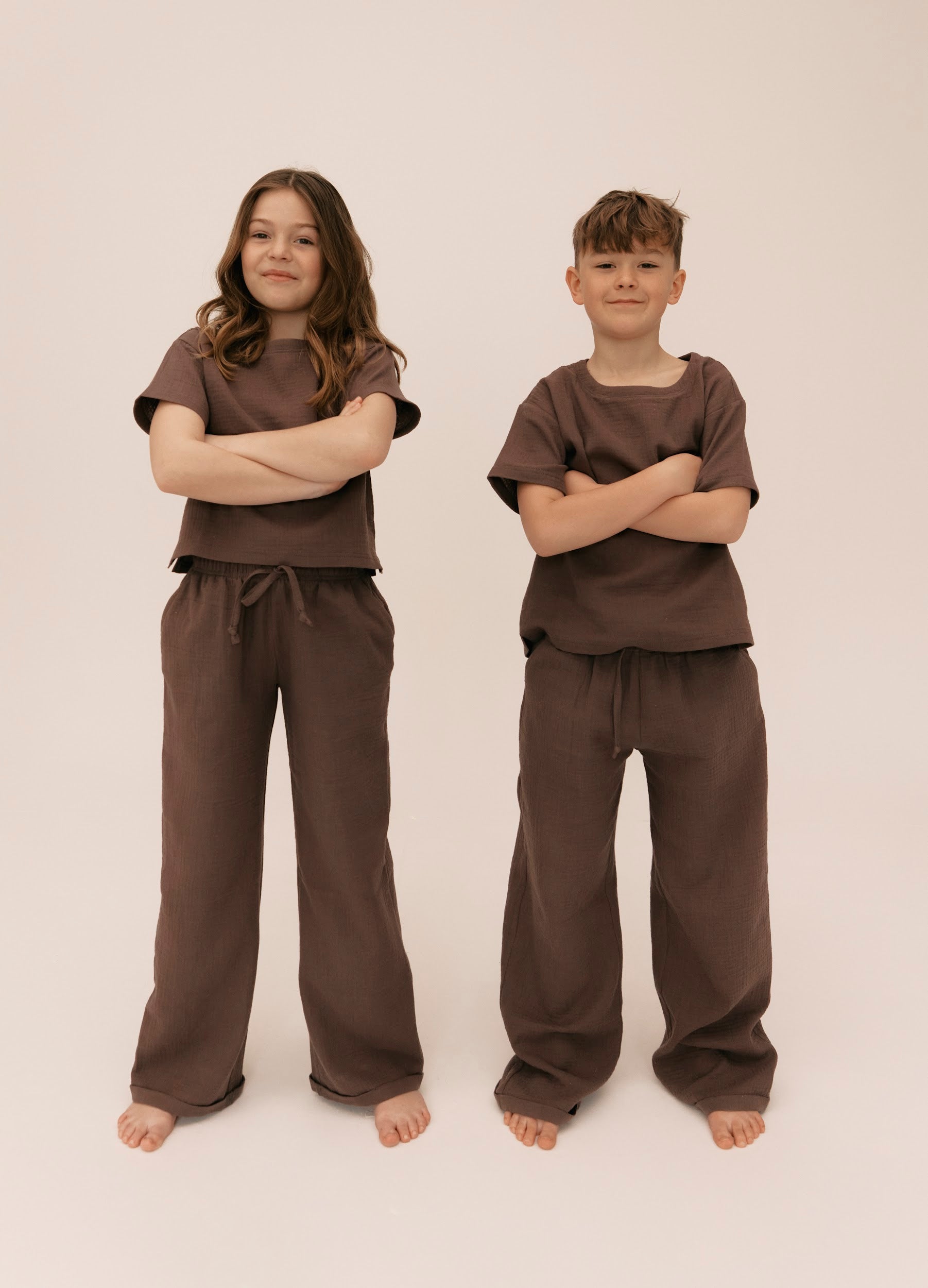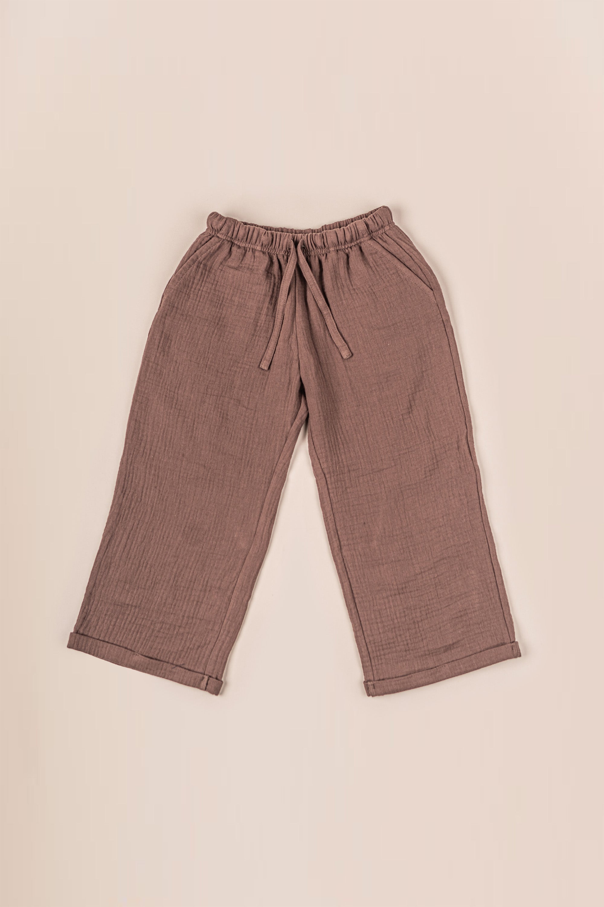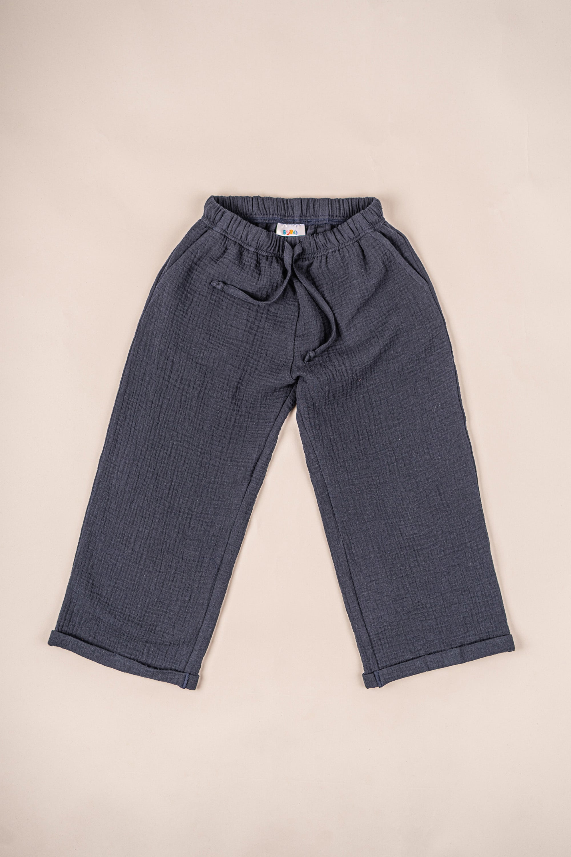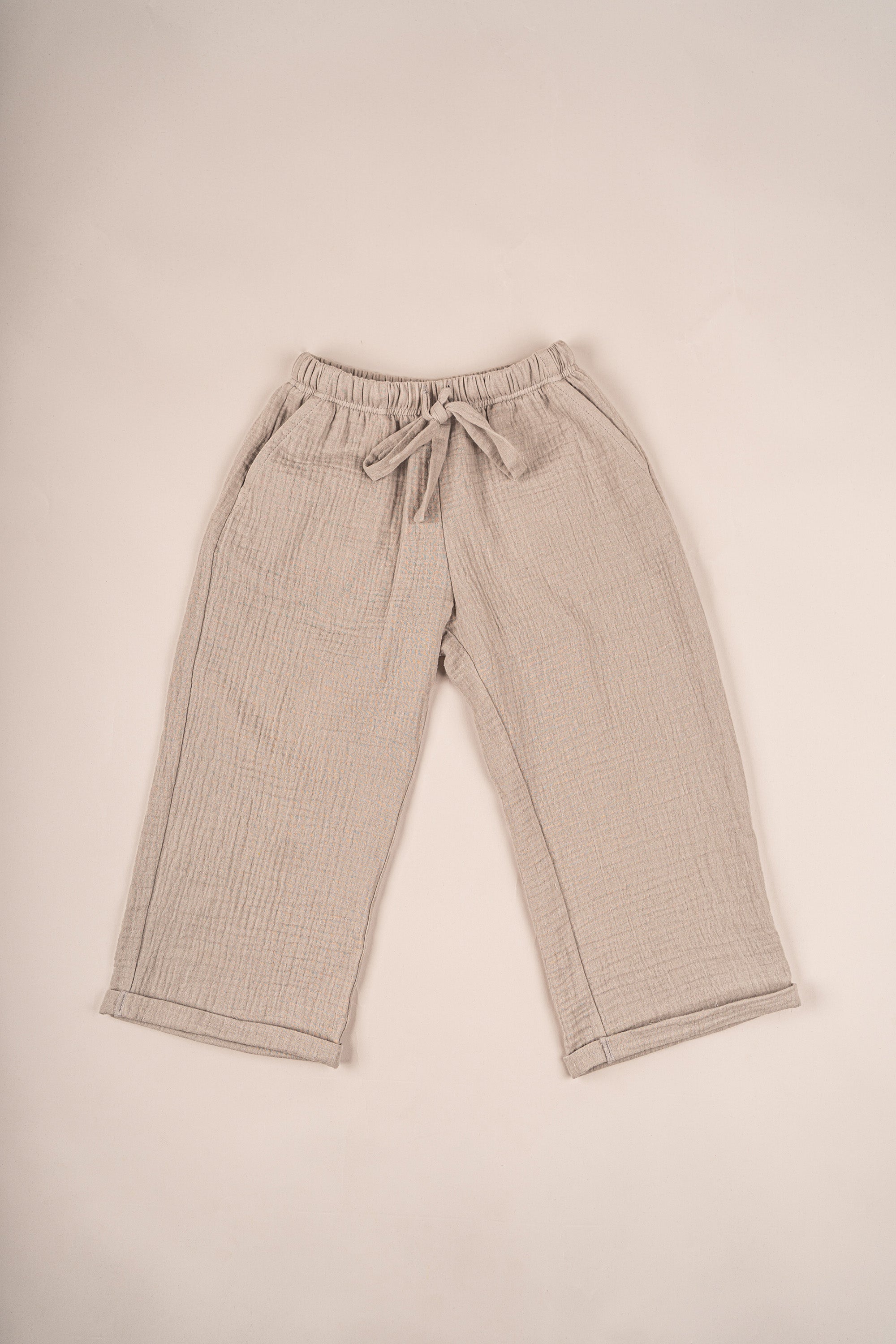 Tyto široké mušelínové kalhoty jsou splněným snem všech dětí, které rády běhají, lezou, skáčou a sní. Lehoučké, měkké a s pohodlným pasem na gumu – prostě láska na první obléknutí.